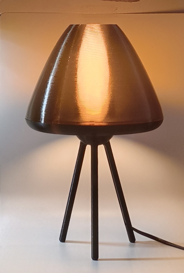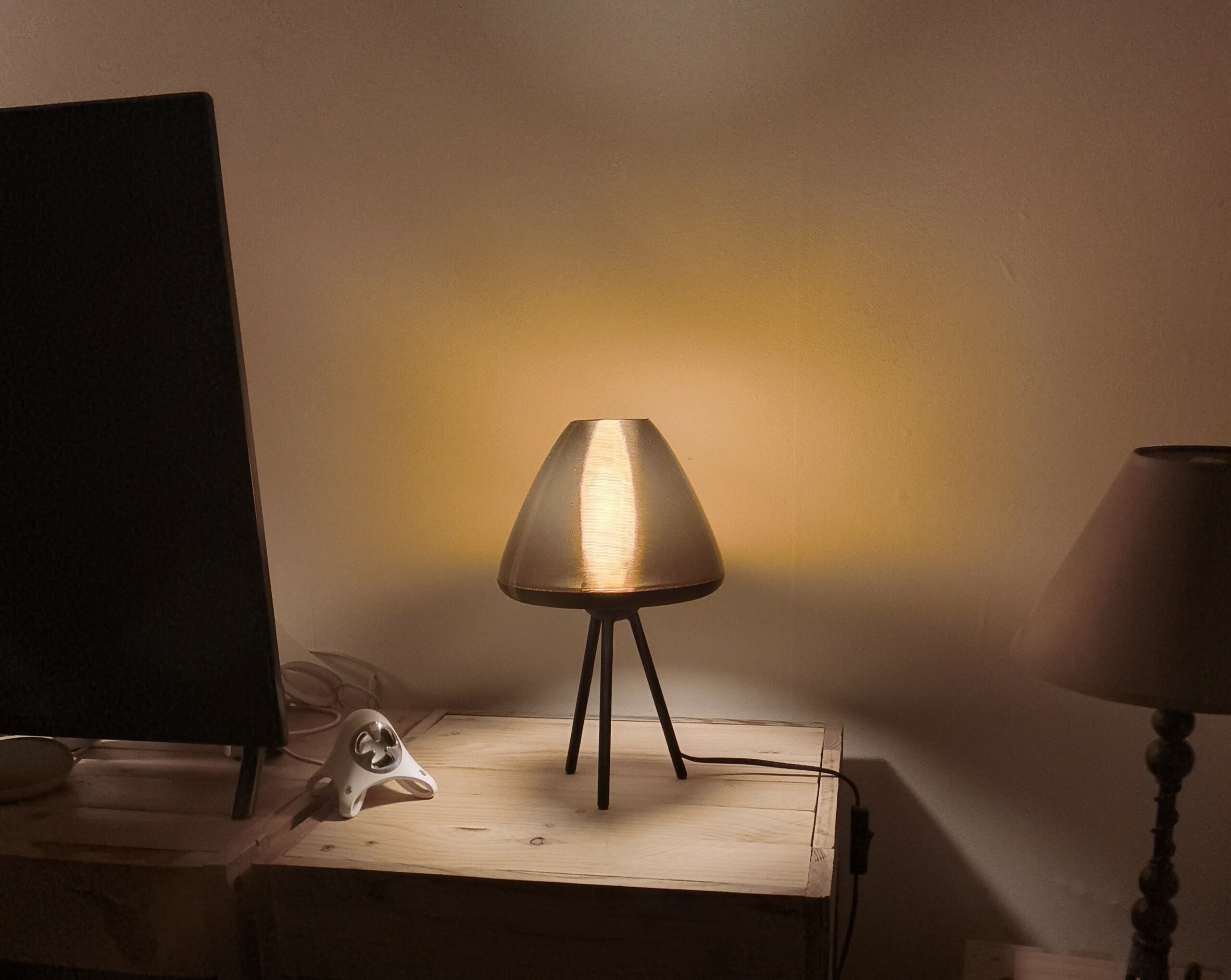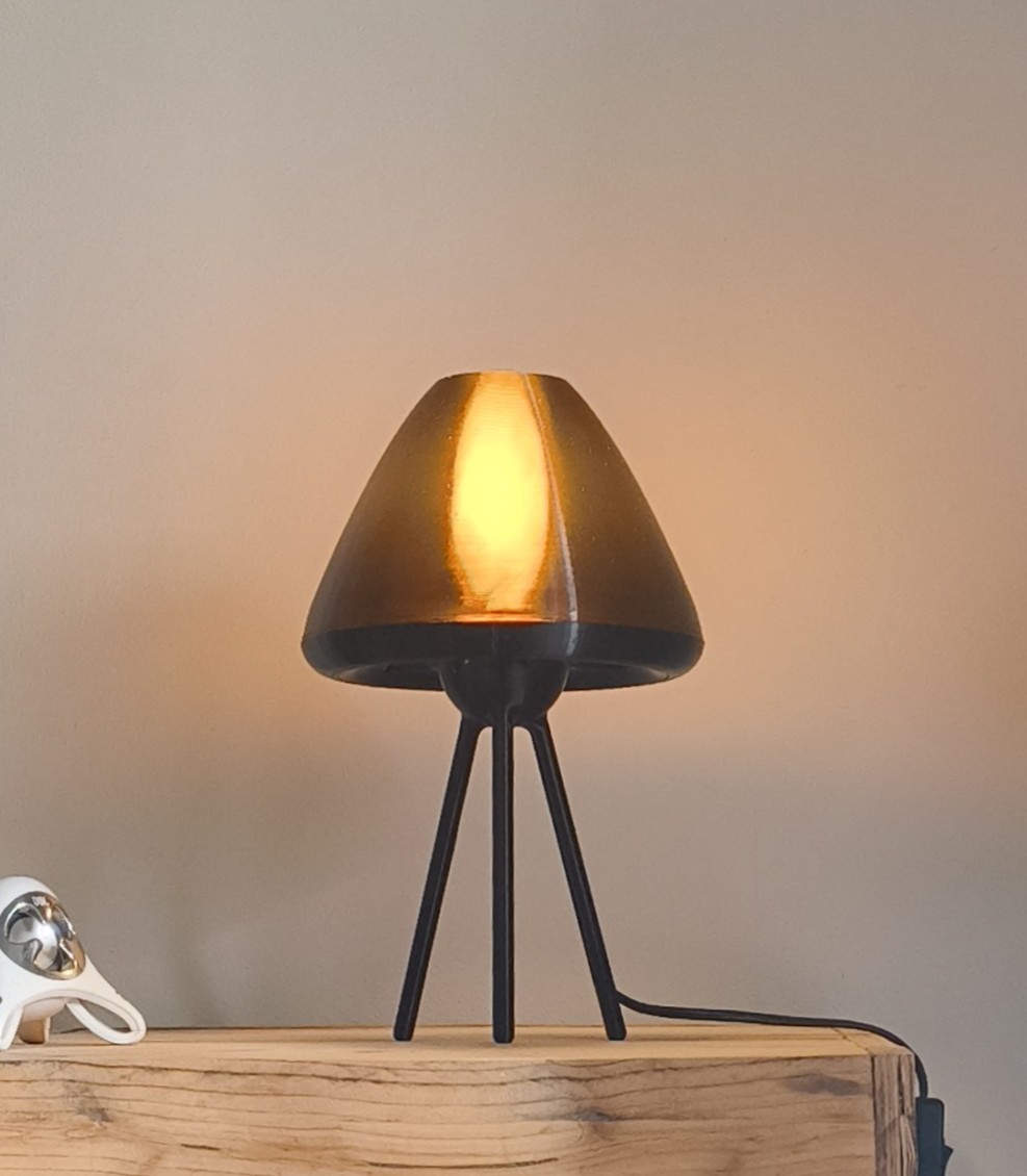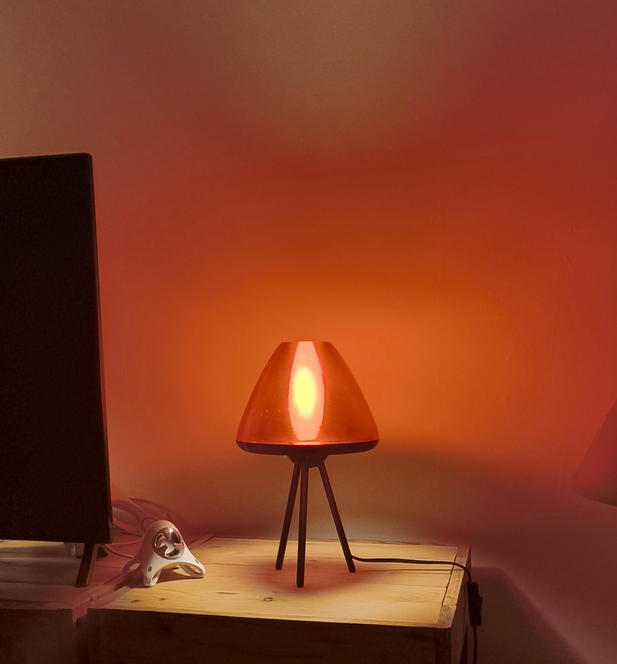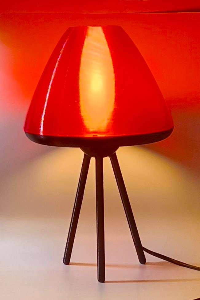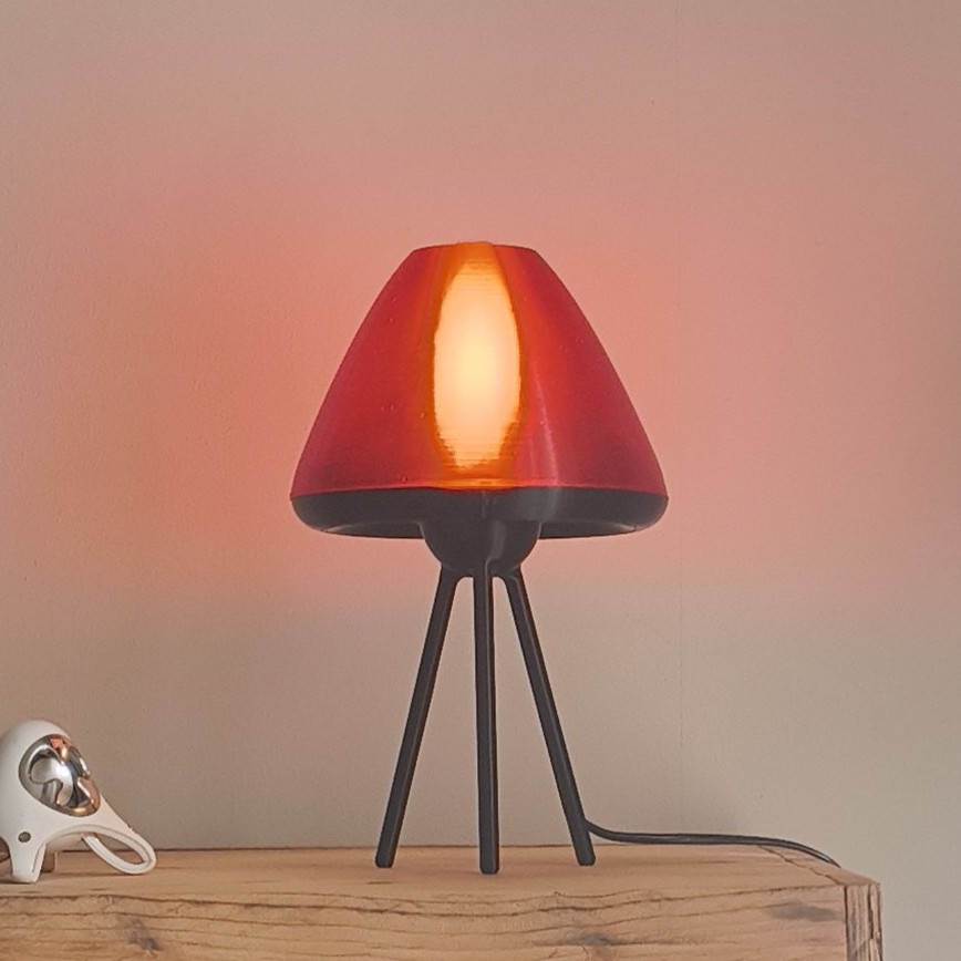 La nuit : La magie opère. La lumière se diffuse à travers les couches d’impression, transformant l’abat-jour en un cœur incandescent. La version ambrée diffuse une chaleur dorée, tandis que la rouge rayonne d’une intensité mystérieuse.